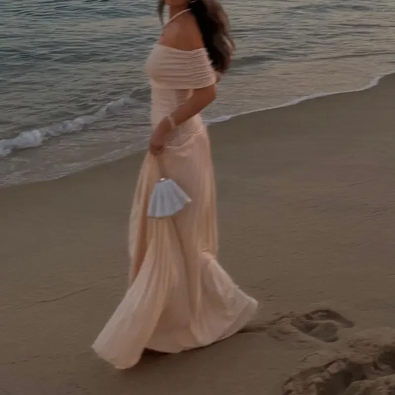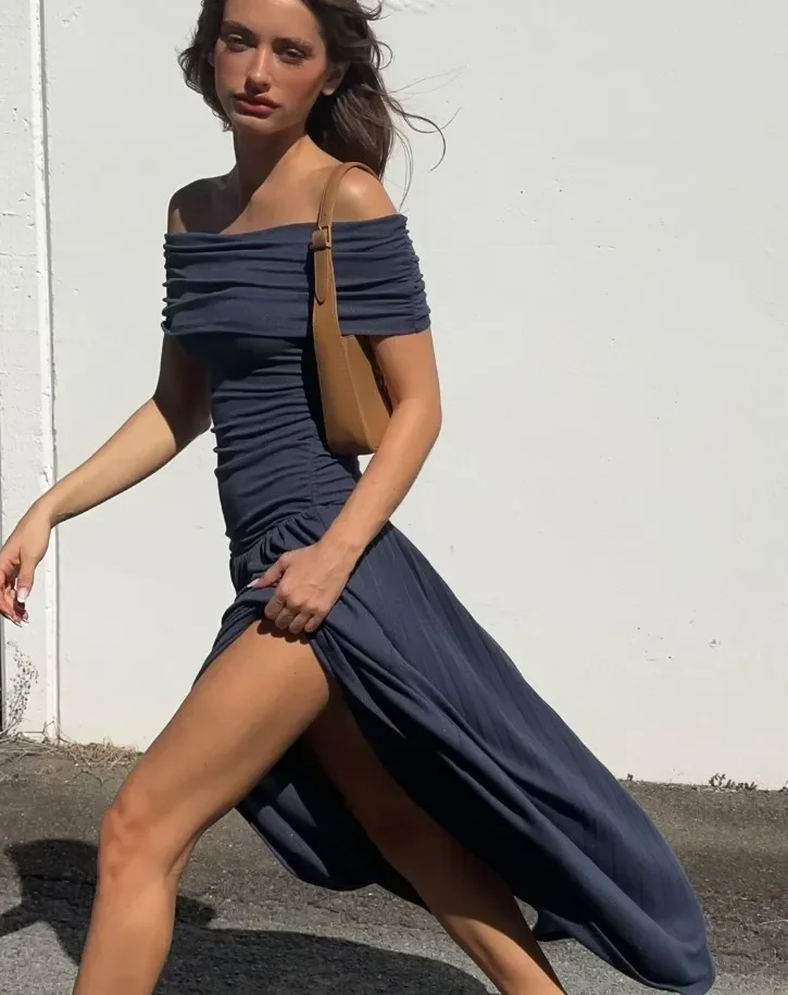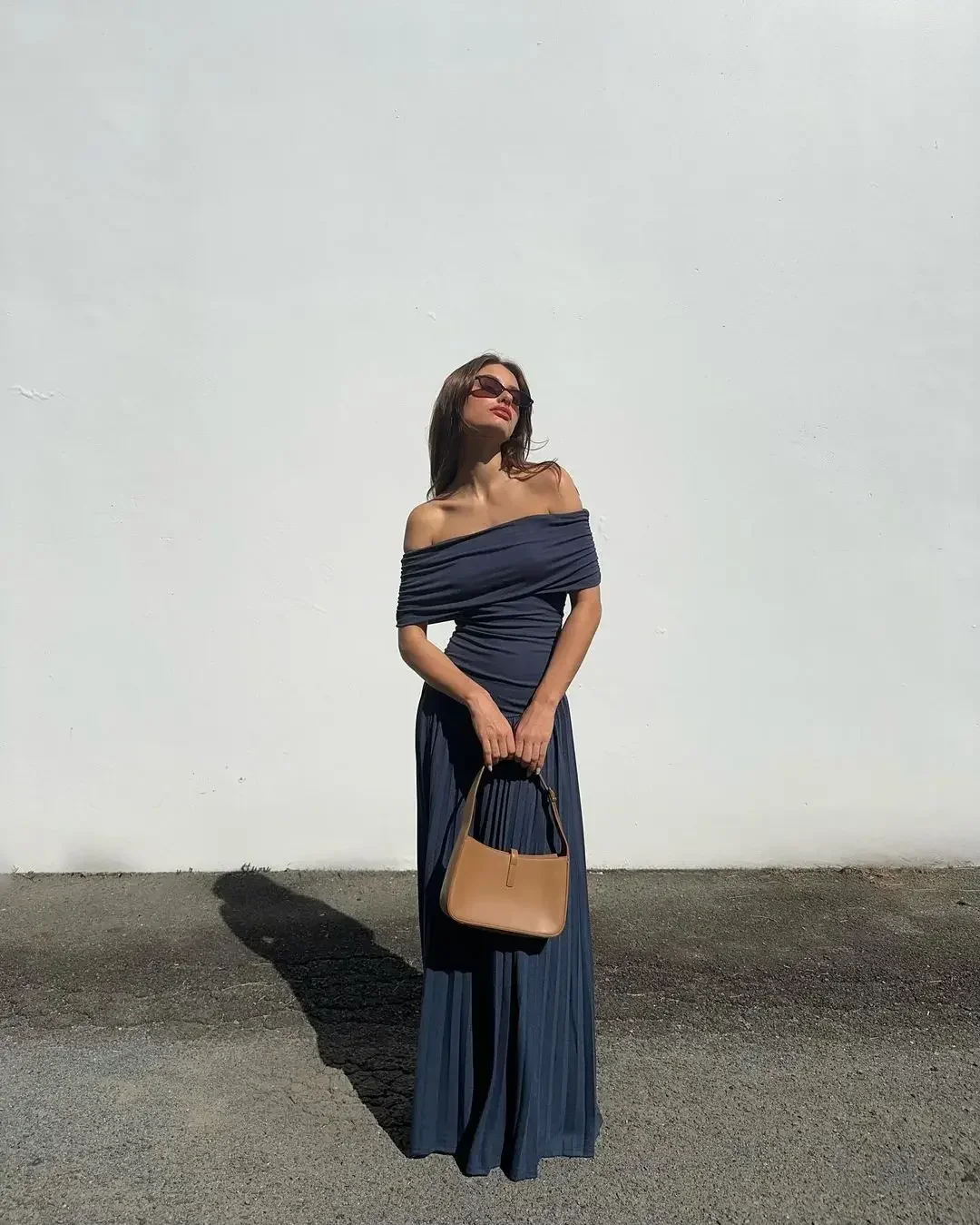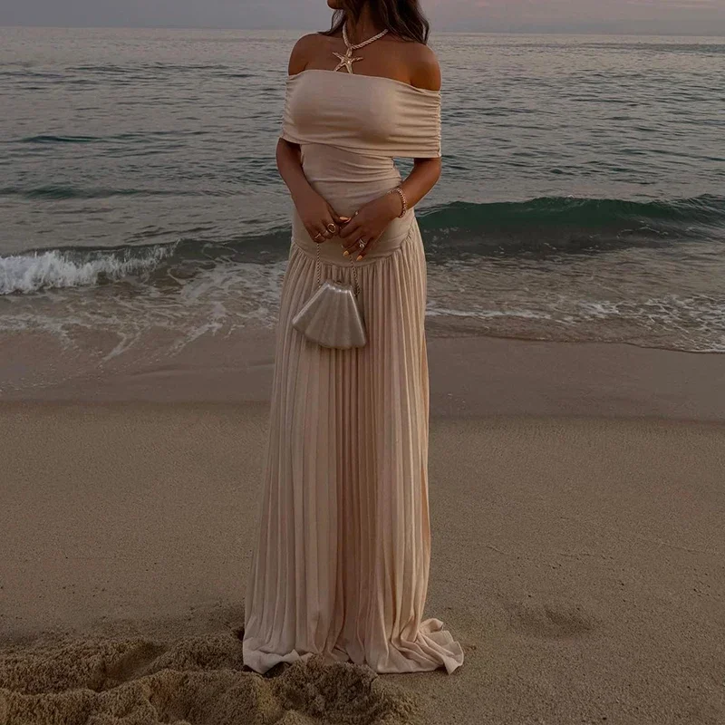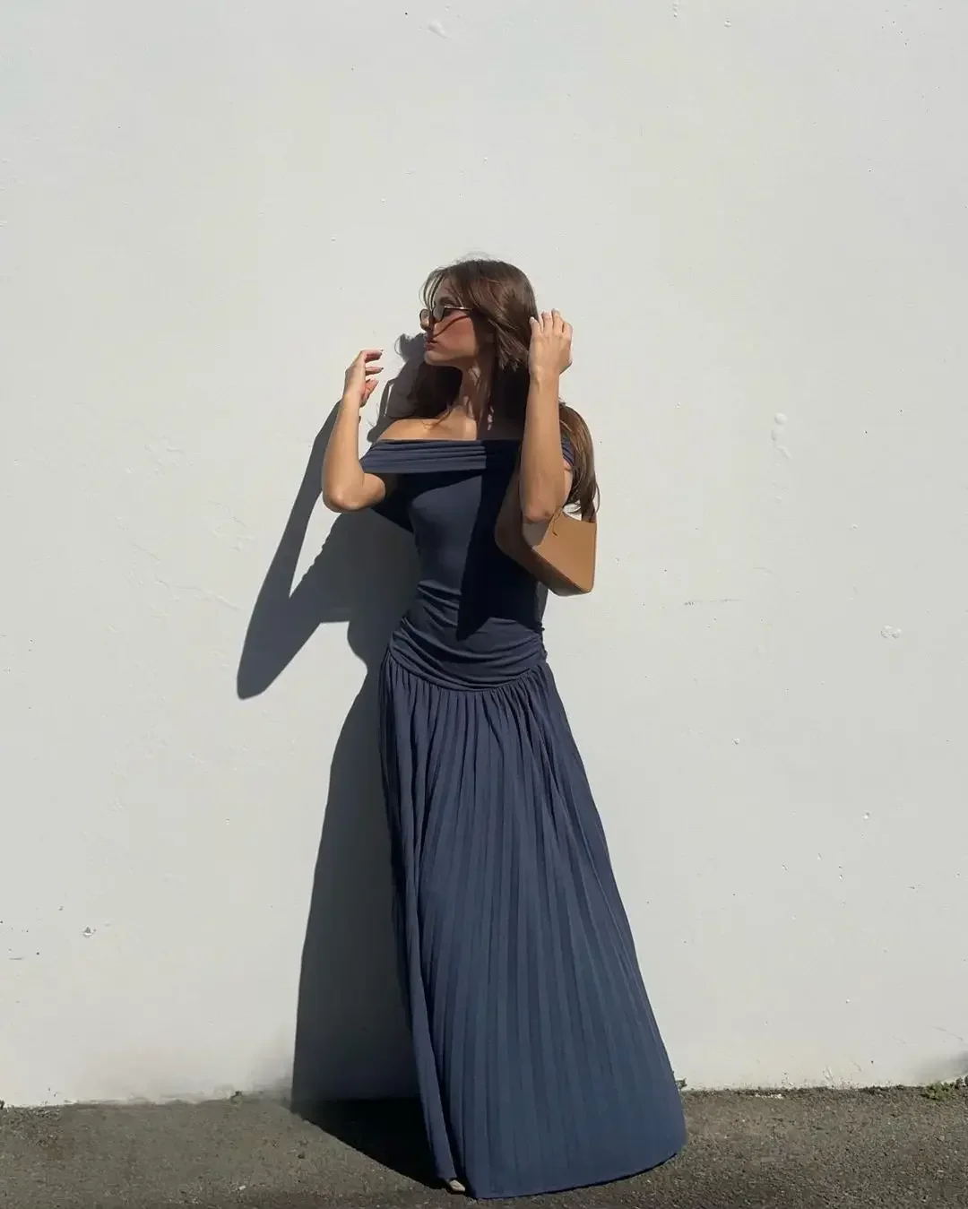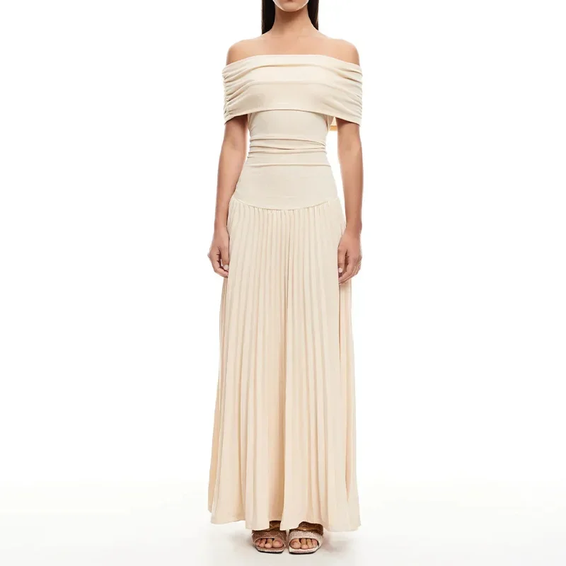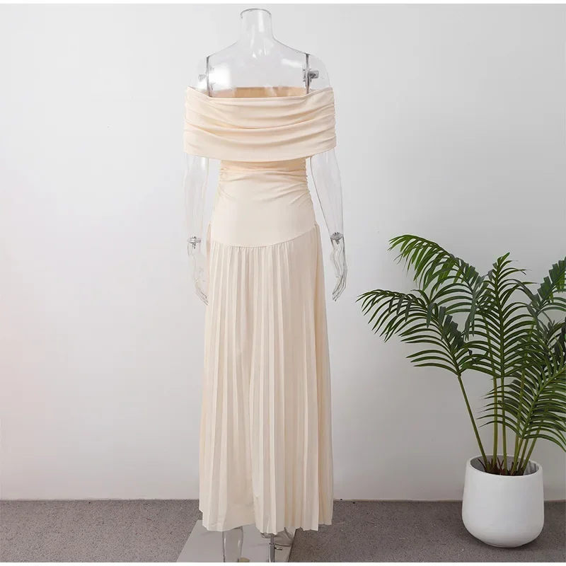 Numéro de Modèle: Elegant Slash Neck Pleated Dress Women