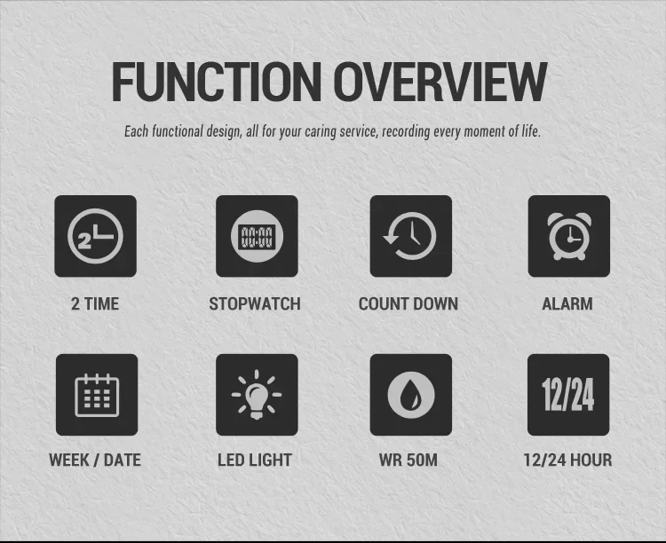 8. Fonction : 2 heures, chrono, alarme, date, semaine, lumière LED, compte à rebours, horloge 12/24 heures.