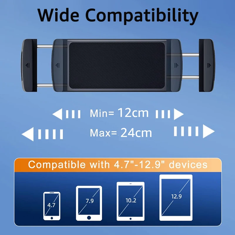 Compatible avec tous les smartphones et tablettes à écran de 4,7 à 12,9 pouces. Le bras de serrage peut s'étendre de 12 cm à 24 cm.